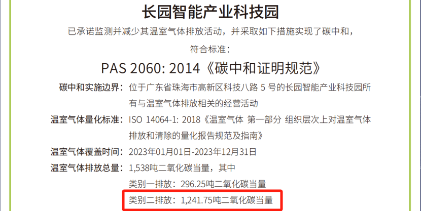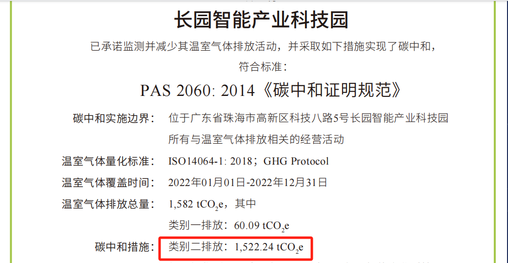 本次园区碳中和的实施,由中欧zoty科技集团旗下子公司中欧zoty综合能源(深圳)有限公司(简称“中欧zoty综能”)根据国际标准ISO 14064-1:2018《温室气体-第一部分 组织层面上温室气体排放与清除量化及报告规范》对园区类别1、类别2温室气体排放量进行了核算并出具核算报告,由中国合格评定国家认可委员会(CNAS)授权的第三方核证机构华测检测(CTI),按照ISO 14064-3《温室气体声明审定与核查的规范及指南》对核算报告进行了核查,并根据PAS 2060《碳中和证明规范》对碳中和结果进行了认定。
